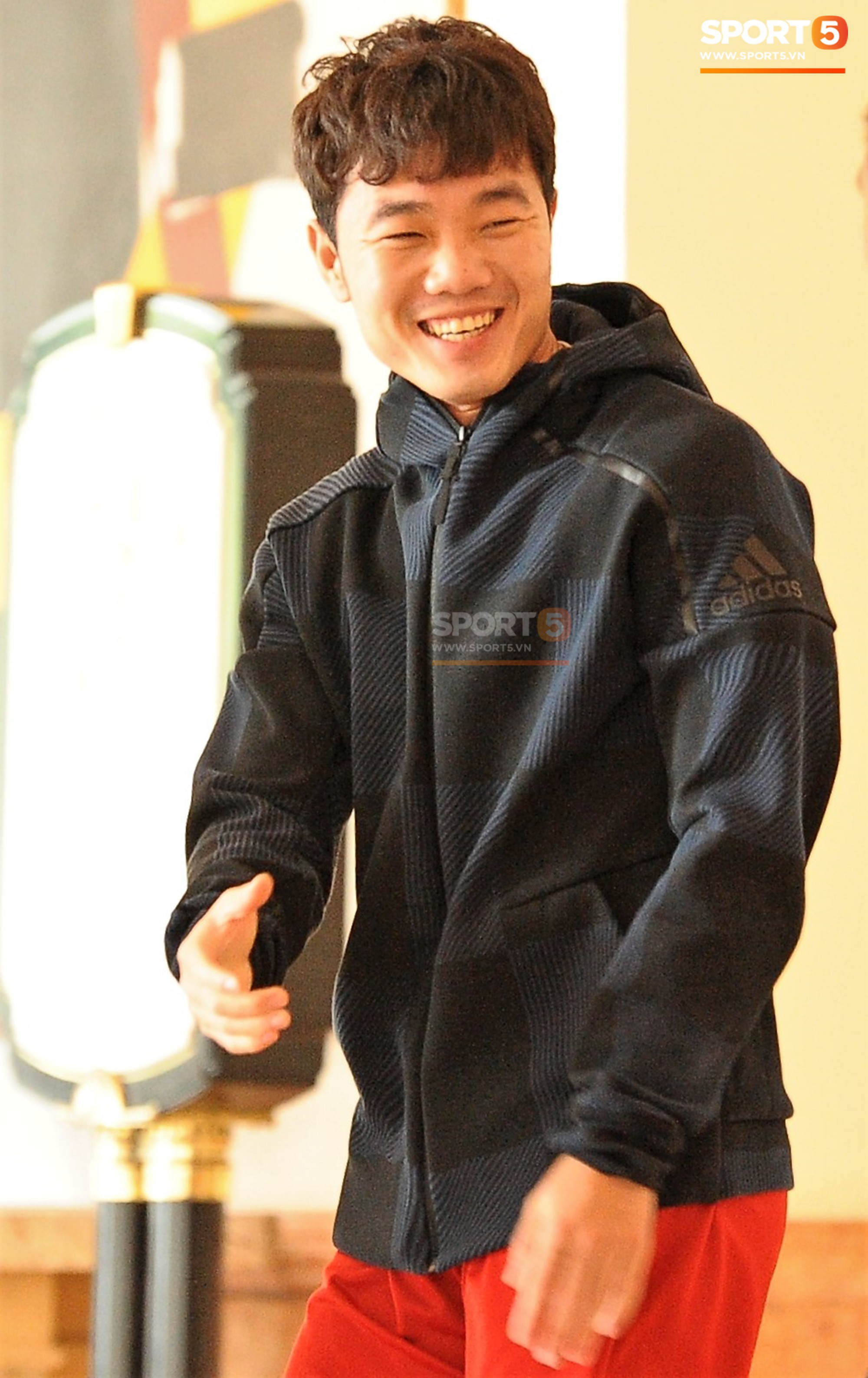 Tiếc là khoảnh khắc đáng yêu ấy của chàng tiền vệ người Tuyên Quang lại chỉ diễn ra không ít phút ngắn ngủi. Khi đi đến thang máy và gặp người hâm mộ, Xuân Trường lấy lại vẻ nghiêm túc của mình.